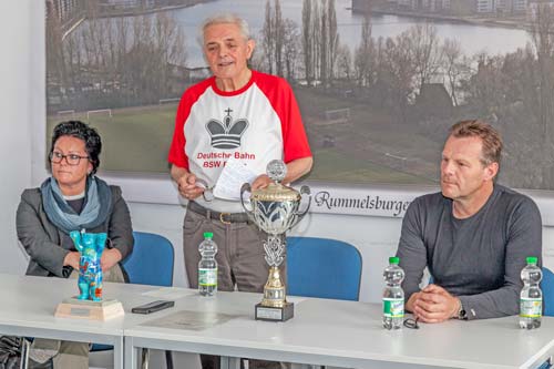 Bei der Siegerehrung ehrten wir auch unsere neuen Schnellschachmeister (15 Minuten pro Partie). Bei seiner ersten Teilnahme gewann Dietmar Gieritz ungeschlagen mit 15,5 Punkten aus 17 Partien vor Jürgen Rollwitz mit 14,5 und Jürgen Schmid mit 12,0 Punkten.