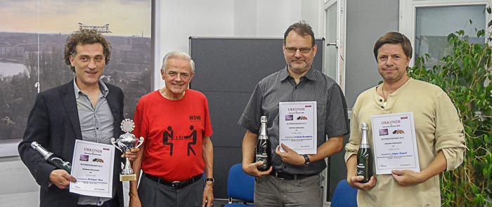 Siegerehrung Gruppe A von links: IM Drazen Muse, Horst Kaiser, FM Rainer Kleeschätzky, Jürgen Schmid