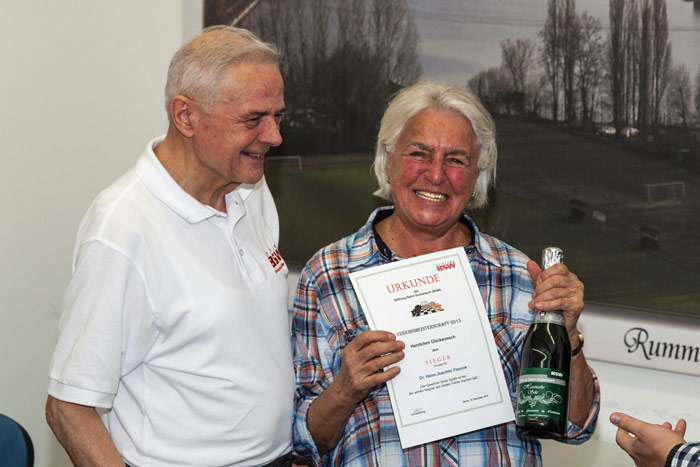 Annemarie Passow nimmt die Ehrung ihres Mannes für den Sieg in der Einzelmeisterschaft der Gruppe B entgegen.