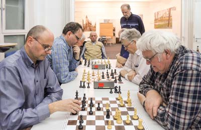 Anschließend wurde in zwei Leistungsgruppen das Blitzturnier gestartet. In der Gruppe A setzten sich die Favoriten durch. Richtig Spannung kam erst in der letzten Runde auf, als der führende FM Rainer Kleeschätzky gegen Dr. Günter Albinus auf Verlust stand. Günter fand aber nicht immer die richtige Erwiderung und so gewann Rainer mit seiner Routine und Können doch noch die Partie. Damit gewann Rainer mit 5,5 Punkten den Wanderpokal, vor seinem Bruder FM Ralf Kleeschätzky 5,0 und Jürgen Zahn mit 4,0 Punkten.