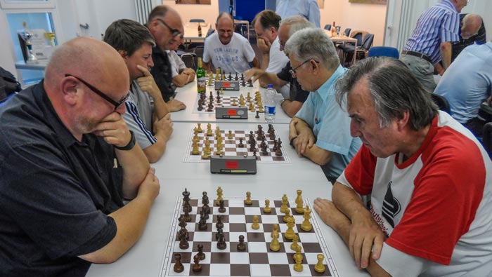 Die A-Gruppe war wieder stark besetzt. Von Beginn an entwickelte sich ein spannender, harter und fairer Kampf um den Sieg, die Urkunden und die Preise. Kein Spieler blieb ungeschlagen. Nach der letzten Runde führten Rüdiger Schüttig (2321) und Jürgen Schmid (2023) punktgleich mit je 6 Punkten aus 8 Partien vor den punktgleichen FIDE-Meistern Rainer Kleeschätzky (2243) und Dr. Fritz Baumbach (2198). Meister wurde Rüdiger nach gewonnenem Stichkampf. Den 3. Platz erreichte Rainer durch die bessere Zweitwertung.