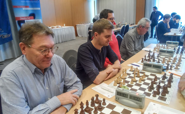 Schönheitspreis für GM Robert Rabiega (vorne rechts) in der Partie gegen FM Hendrick Schramm.