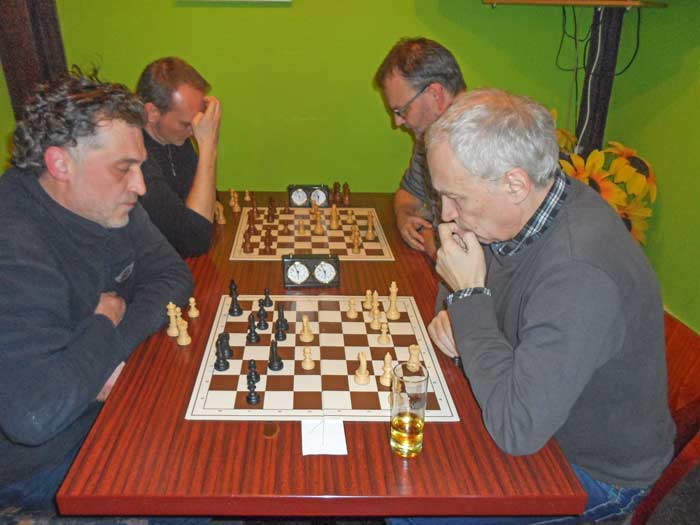 IM Lars Thiede (hinten links) gegen FM Rainer Kleeschätzky (hinten rechts) 1:0