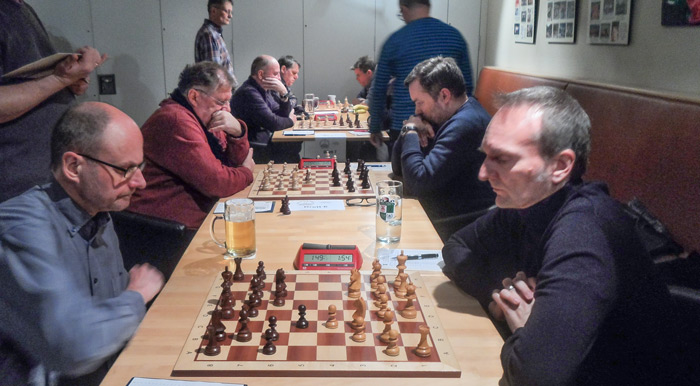 Nach zweieinhalb Stunden endeten die Partien von Rüdiger Schüttig gegen IM Nogly und Jens Wiedersich gegen Dr. Kettenburg unentschieden. IM Drazen Muse und Andreas Woschech setzten ihre Stellungsvorteile gegen Dr. Feikes und FM Kurz konsequent zum Sieg um. Damit stand es 3:1 für unsere Mannschaft. Eine kleine Vorentscheidung. Aber nicht mehr, denn die anderen vier Partien waren noch umkämpft. Zunächst sah sich FM Rainer Kleeschätzky für sein zielstrebiges Spiel und Kampf gegen FM Florstedt mit einem Remis belohnt. Dann besiegte GM Robert Rabiega nach einem interessanten Kampf IM Suran und sicherte damit den Finalerfolg.